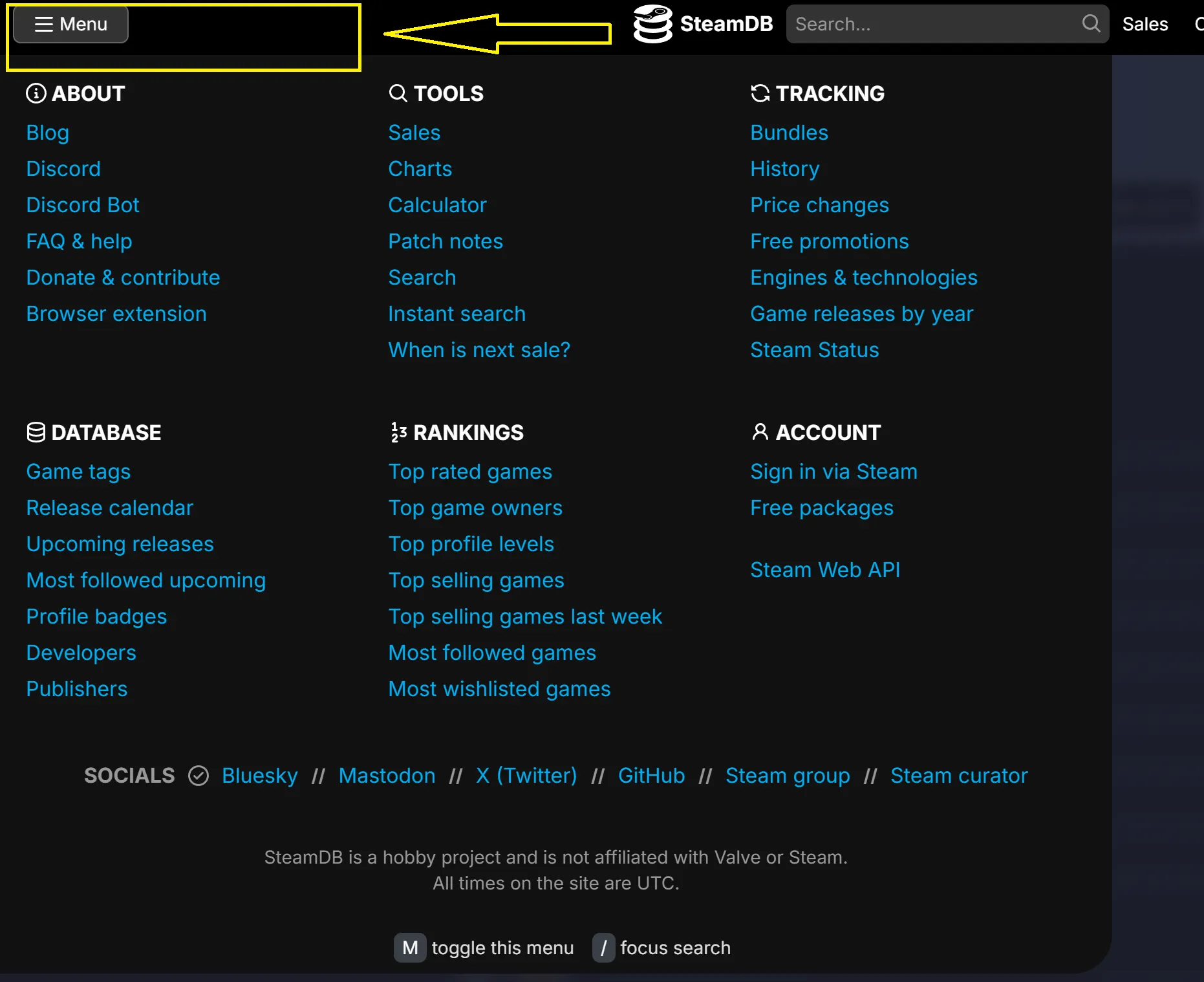 SteamDB의 메뉴는 크게 ABOUT, TOOLS, TRACKING, DATABASE, RANKINGS, ACCOUNT의 6가지 카테고리로 나뉘어져 있습니다. 각 메뉴의 기능은 다음과 같습니다.