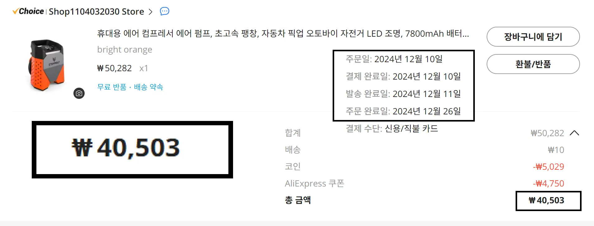 2024년 12월 10일: 알리익스프레스 45,253원 - 코인 추가할인 5,029원 = 40,503원