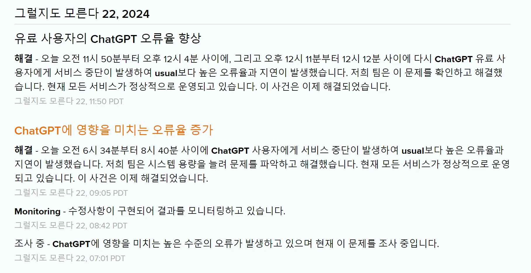 서버 상황을 실시간으로 확인하기 위해서는 OpenAI 상태 사이트에서 이메일 알림을 등록하는 것이 좋습니다.