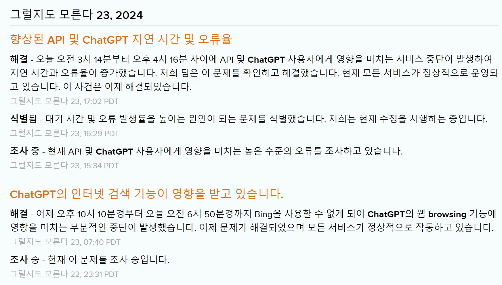 ChatGPT 외에도 OpenAI가 제공하는 다양한 API 서비스의 상태를 한눈에 확인할 수 있습니다.