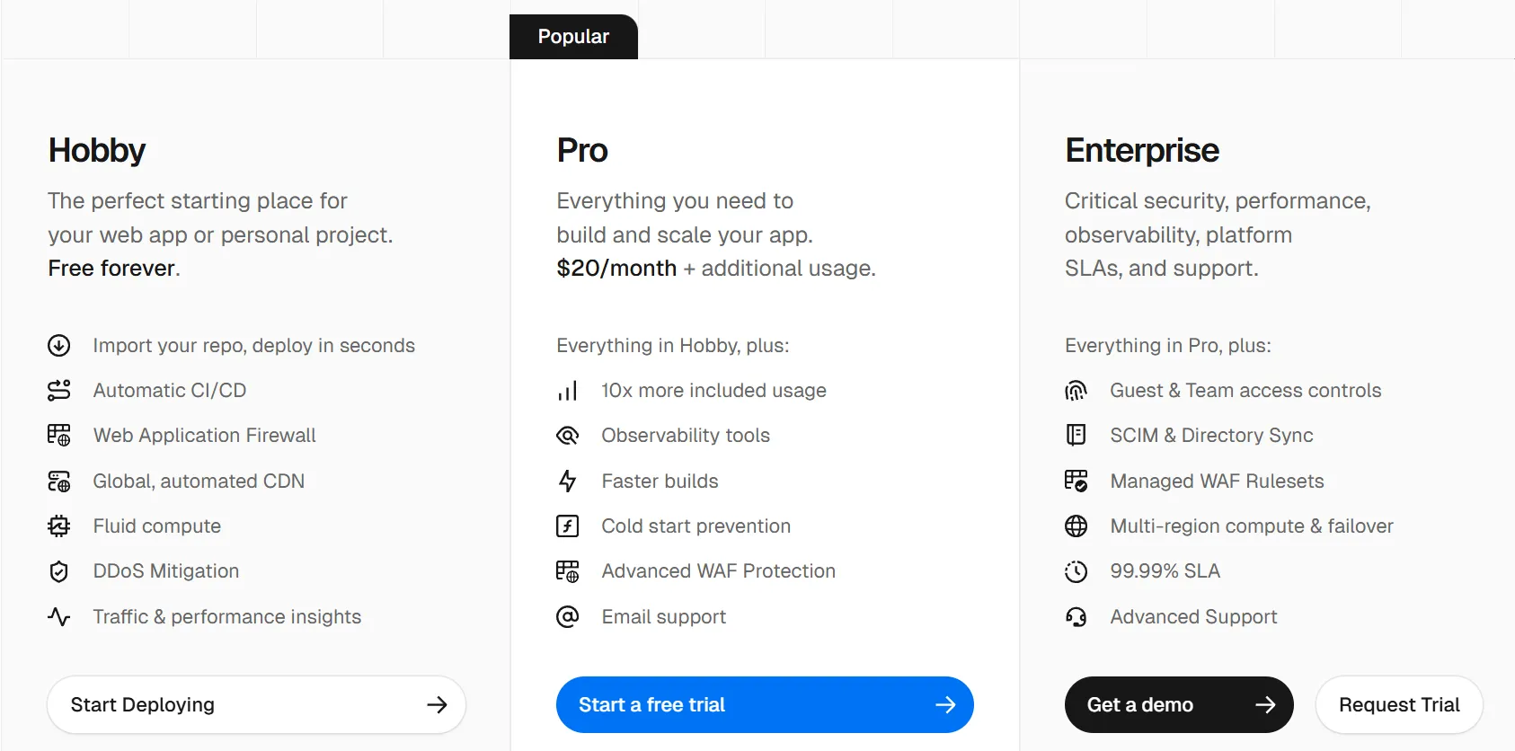 Vercel은 세 가지 요금제를 제공합니다. 각 플랜은 서로 다른 규모와 요구사항을 가진 팀을 위해 설계되었습니다.