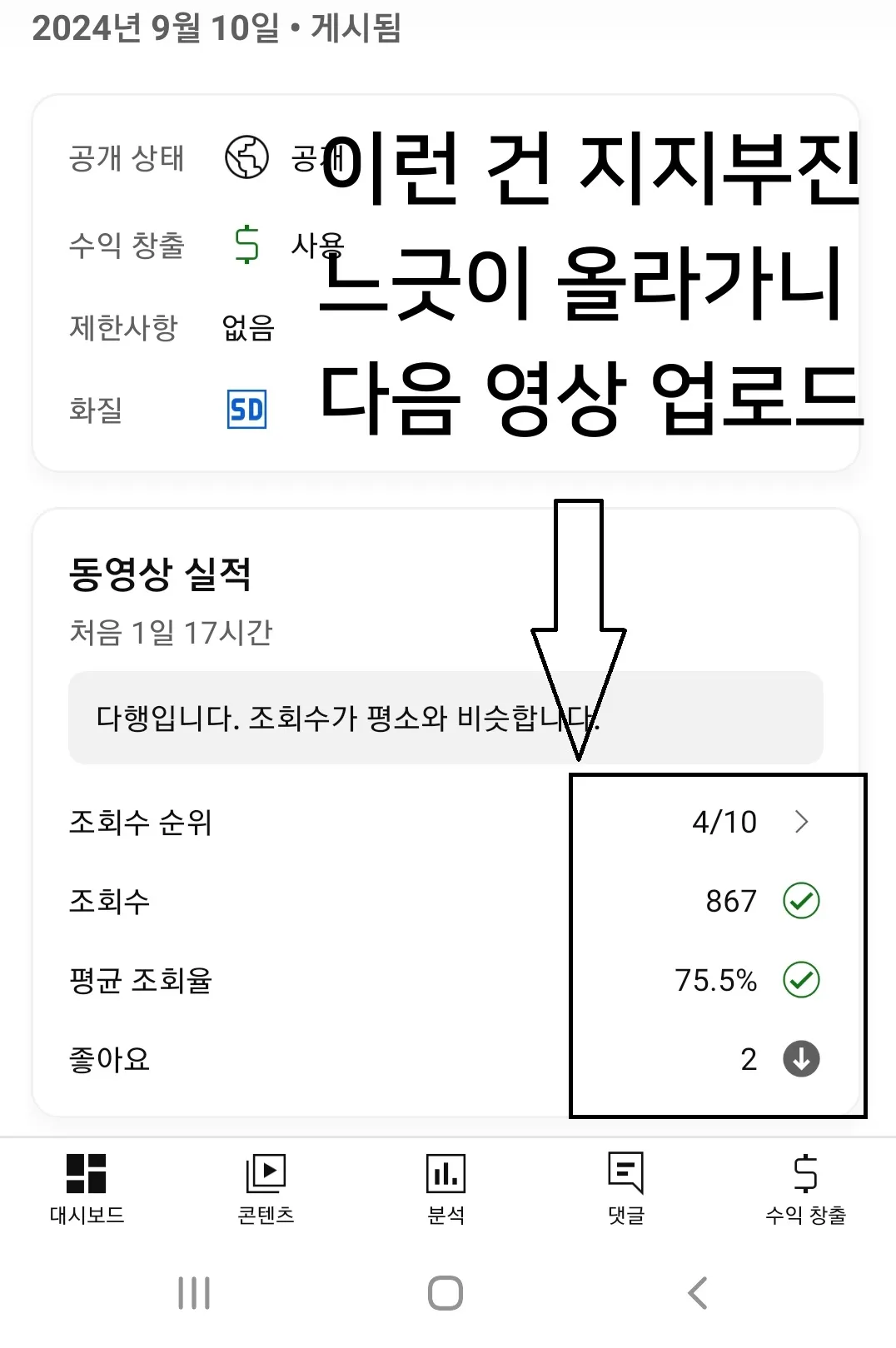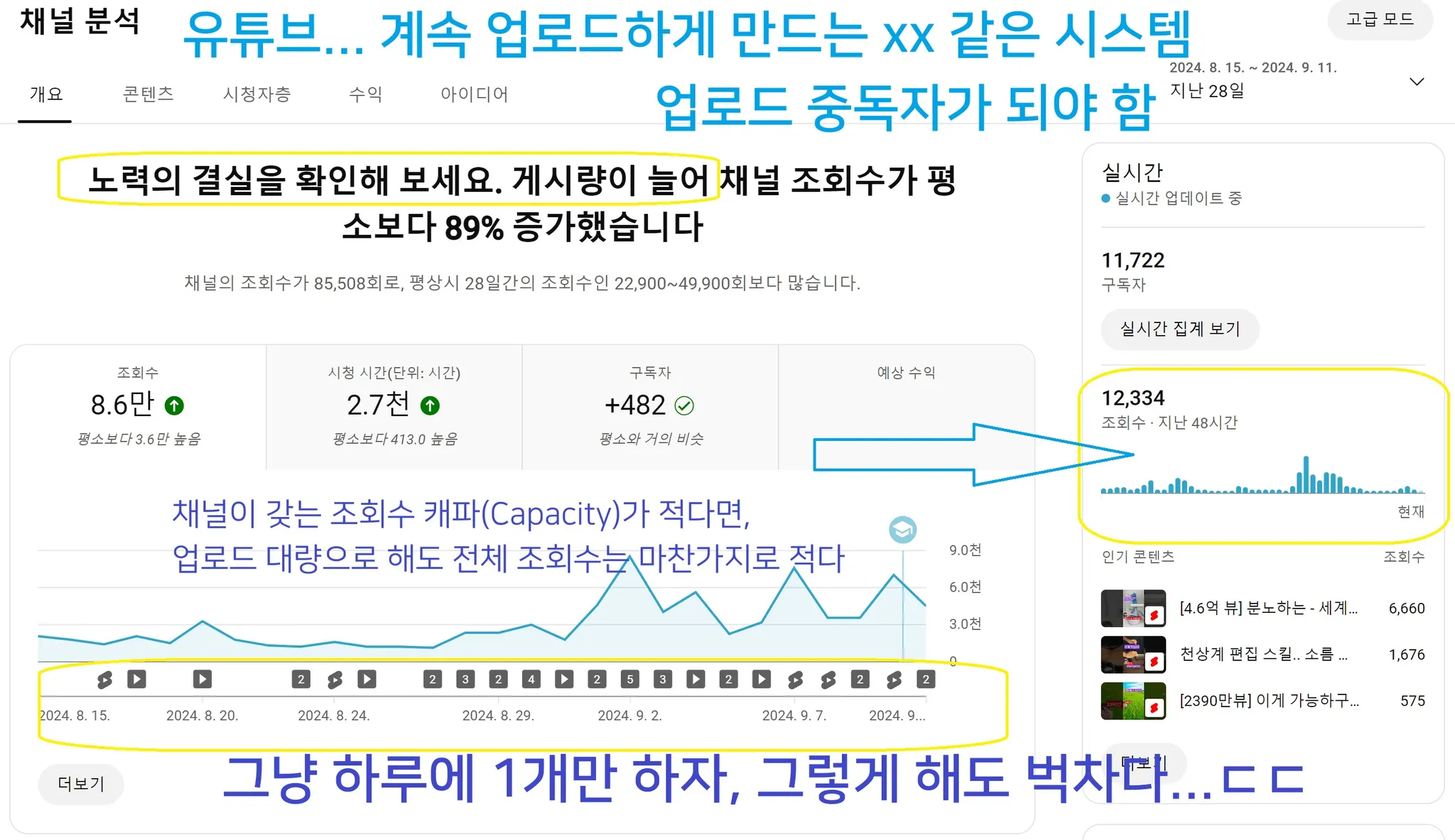 주기적인 분석: 업로드한 영상의 성과를 분석하고, 다음 콘텐츠를 준비하는 시간을 가지며 꾸준한 개선을 이어가세요.