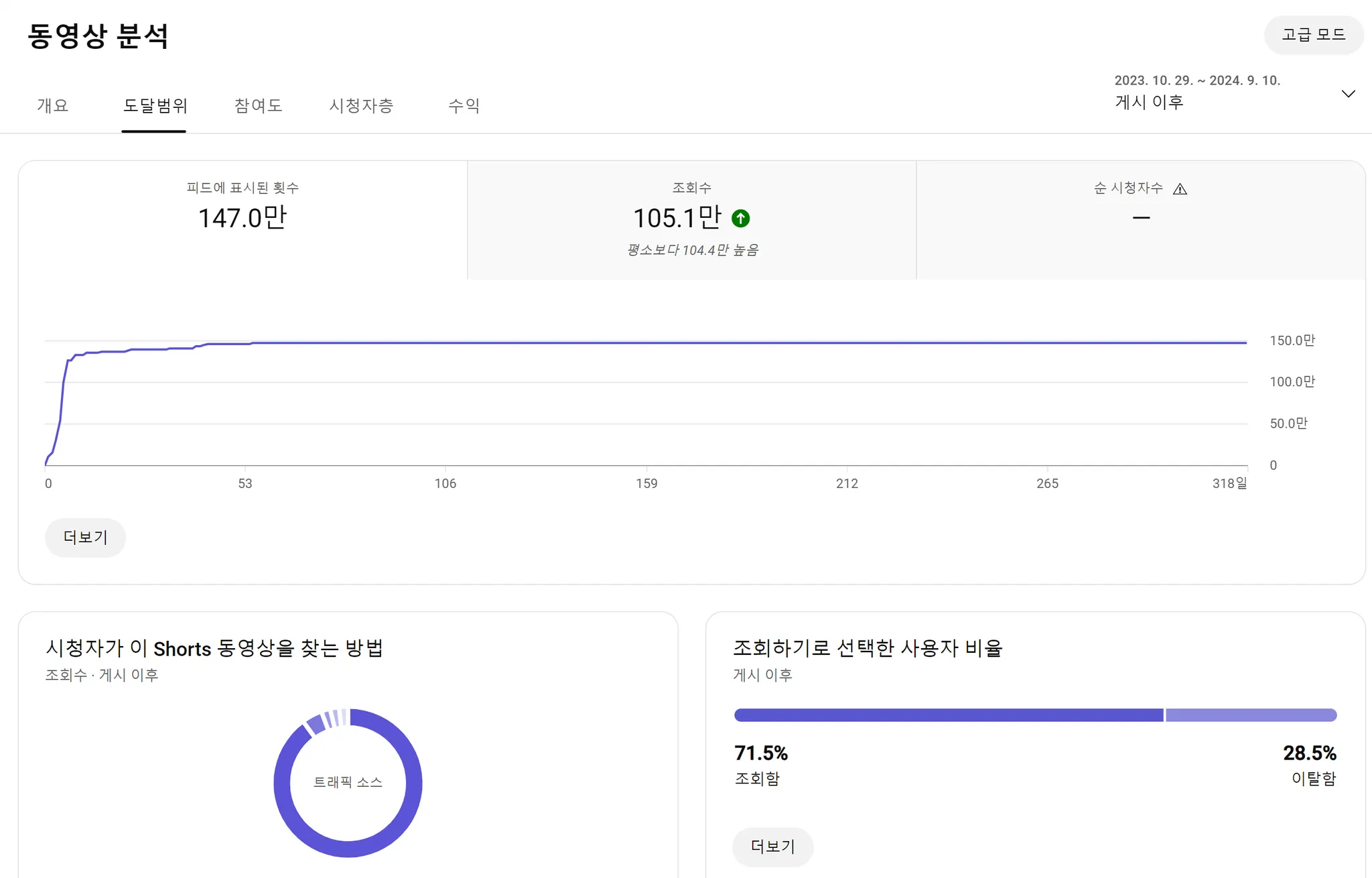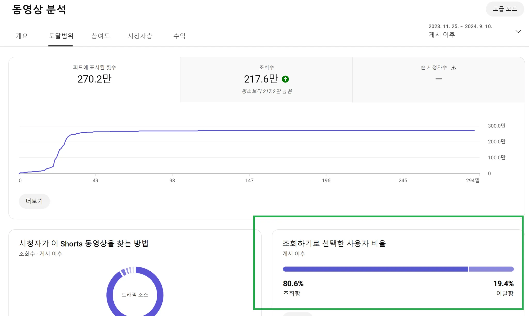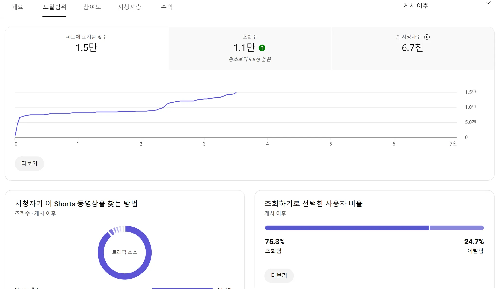 컨텐츠 반응 적을 시 : 만약 시드 오디언스가 숏츠에 잘 반응하지 않으면, 이후에 오는 조회수는 대부분 다른 트래픽 소스에서 온다.