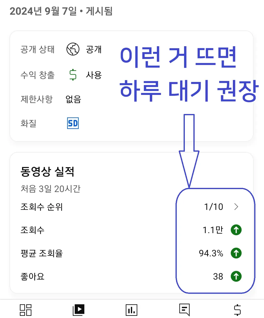 성과 유지를 위한 대기: 좋은 성과를 내고 있는 영상이 있을 때 바로 다음 영상을 올리면 조회수가 분산될 수 있으므로, 최대한 성과를 유지한 후에 새로운 영상을 업로드하세요.