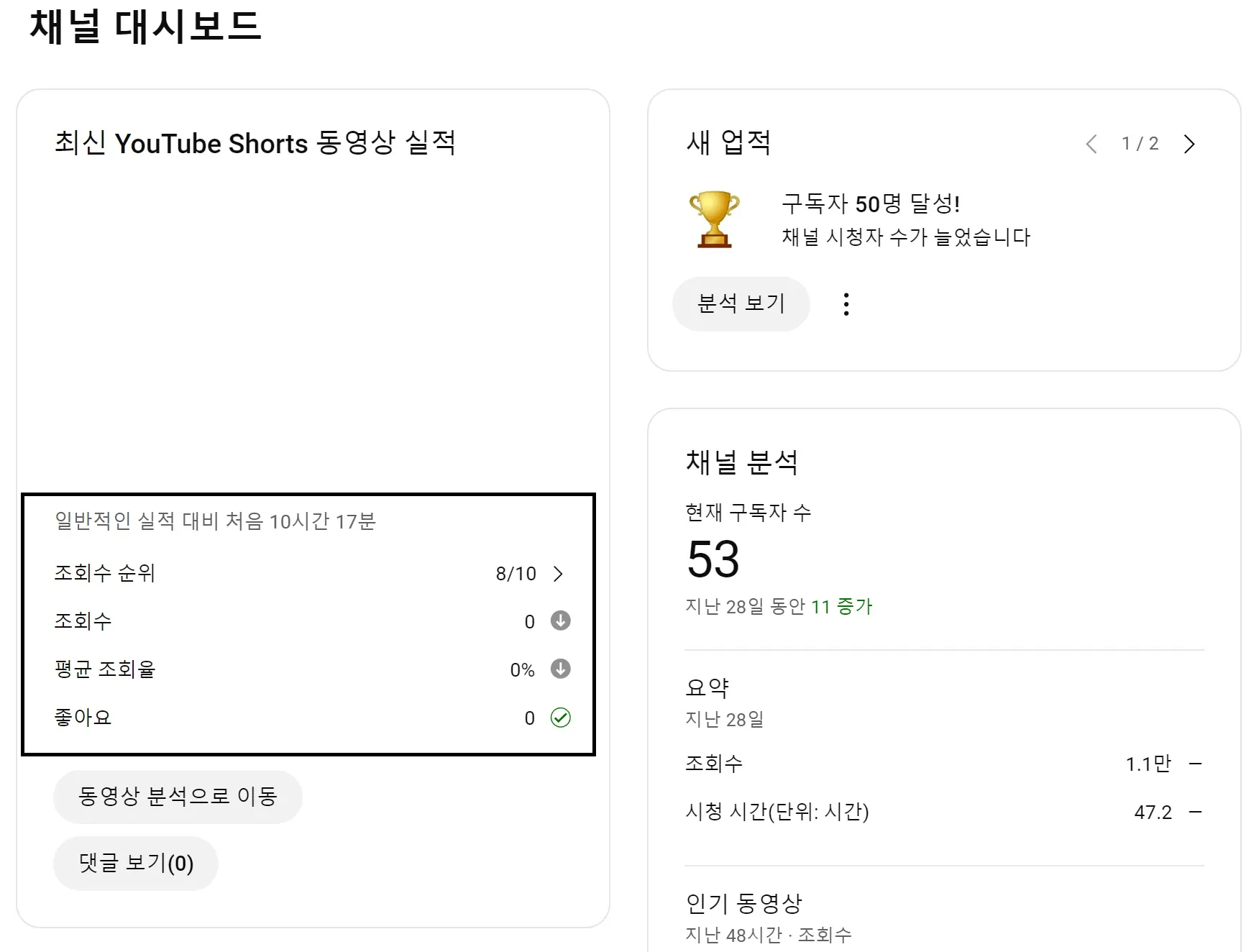 지표 분석 후 개선: 유튜브 스튜디오의 분석 도구를 통해 조회수, 시청 지속 시간, 이탈률 등을 확인한 후, 성과가 낮은 부분을 개선하고 다시 테스트하세요.