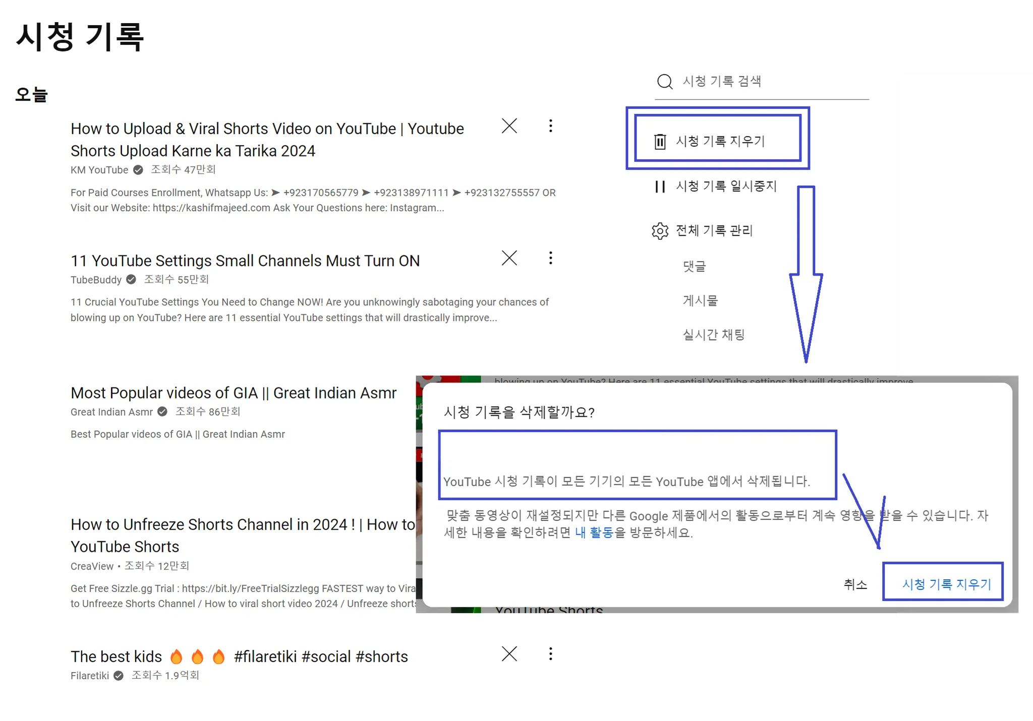 시청 기록 지우기 - 채널 여러개 운영 -이 영상, 저 영상 보게 될 경우 기록 지우고 유사 영상 시청